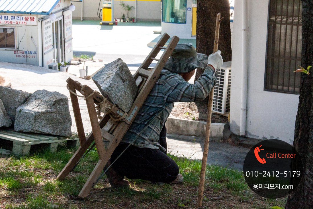1. 굴삭기(포크레인) 등 장비가 올라갈 수 없는 벽제묘지 안OO님 묘소에 축대(석축)을 쌓기 위해 견치석(간지석)을 지게로 올리는 모습입니다.